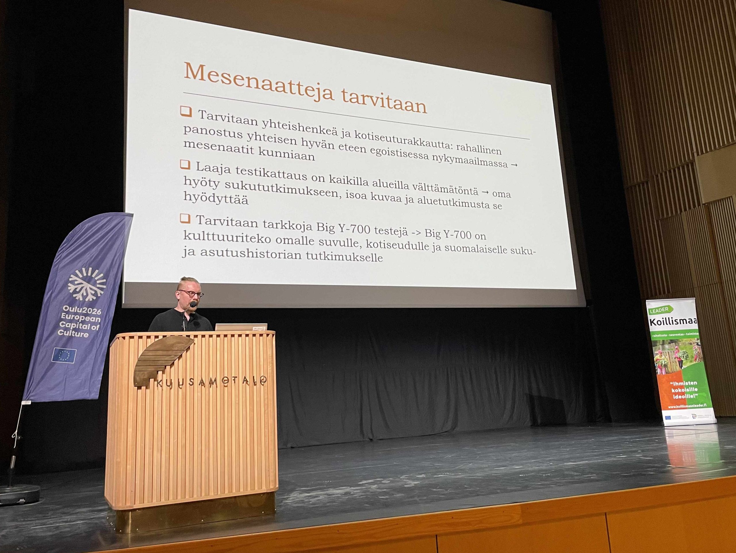 Osallistuin kutsuttuna luennoitsijana Kuusamossa pidettyyn Suku on kulttuuria -seminaariin lauantaina 11.4.2026. Luennon ulkopuolisena aikana pidin DNA-pistettä Kuusamotalon aulassa.